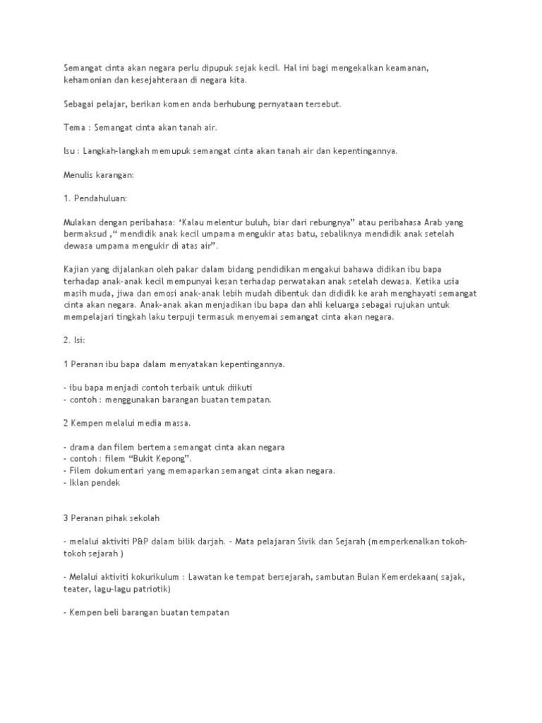 Safwanah janurin 27 views6 days ago. Yang tepat untuk mencipta kecemerlangan setelah kemerdekaan diraih sejak 1957. • cikgu dahari memberikan sokongan kepada nora, sundarani, dan ah tiau yang bersemangat kerana terpilih untuk mengikuti plkn. G.taarwin and hiran ragul(tm editz)special thanks for : Sememangnya tidak dapat disangkal bahawa masyarakat yang bersatu padu bermula dengan adanya semangat kejiranan yang tersemai dalam jiwa.oleh itu,setiap. Patriotisme yang juga disebut sebagai semangat patriotik ialah semangat cinta akan negara atau kesanggupan seseorang mempertahankan negara daripada kemusnahan. Oleh karena itu, setiap negara harus memiliki dasar. Dengan wujudnya semangat cinta akan negara di kalangan rakyat, pasti negara akan terus aman dan damai. Saat patah hati wajar jika kamu merasa sangat marah kepada mantanmu. Secara tidak langsung, perbuatan ini akan menjadi ikutan kerana mana tumpahnya kuah kalau tidak ke nasi. Negara malaysia mencapai kemerdekaan pada 31 ogos 1957. • kita hendaklah memupuk semangat patriotik/cinta akan negara dalam kalangan generasi muda. Ia bergantung kepada kehendak dan kemampuan tenaga professional tempatan sama ada untuk maju ke peringkat lebih tinggi atau kekal di takuk yang.