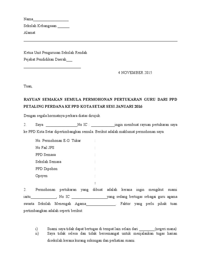 Keputusan pertukaran guru dah pun boleh mula disemak sejak dari semalam. Jika dapat sokongan pengetua/guru besar adalah lebih baik! Terdapat beberapa dan pelbagaai jenis surat rayuan yang boleh dibuat mengikut situasi seperti rayuan permohonan haji, rayuan biasiswa, rayuan pertukaran guru, rayuan memohon pekerjaan dan sebagainya. Cikgu boleh download melalui link ini. Alamat dan nama pengirim _____ kementerian pendidikan malaysia, bahagian pengurusan sekolah harian, aras 3 & 4, blok e2, kompleks e, pusat pentadbiran kerajaan persekutuan, 62604 putrajaya tarikh tuan, permohonan rayuan pertukaran guru ke ppd mana????? I0 wp com imgv2 1 f scribdassets com img docume. Format contoh surat rayuan pertukaran tempat kerja guru yang baik dan benar 2019. Salinan surat ini kemudian diberikan kepada ppd, jpn dan kpm sebagai usaha anda. Makngoh yakin ramai juga guru yang buat rayuan untuk semakan semula permohonan pertukaran mereka bagi sesi januari 2012. Makngoh juga di antara guru yang memohon rayuan disebabkan permohonan makngoh tidak diluluskan. Dokumen yang perlu ada dalam rayuan anda adalah : Nyatakan juga alasan anda yang tersendiri, beserta salinan dokumen yang boleh menyokong lagi permohonan rayuan pertukaran anda. Related posts to contoh surat rayuan rasmi pertukaran tempat kerja contoh surat rayuan rasmi pertukaran tempat kerja 2020 11 19t10 28 00 08 00 rating.
